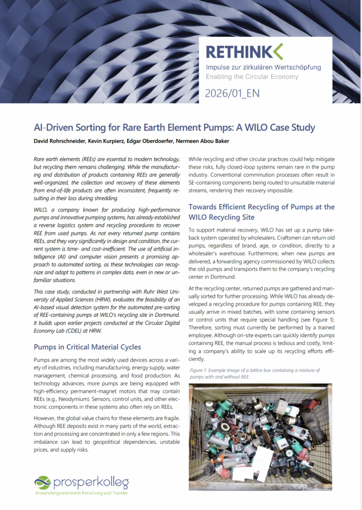 Seltene Erden (SE) sind für moderne Technologien unverzichtbar, doch ihre Wiederverwertung gestaltet sich nach wie vor schwierig. Während Herstellung und Vertrieb von Produkten mit SE meist gut strukturiert sind, fehlt es häufig an einheitlichen Verfahren zur Sammlung und Rückgewinnung dieser Elemente aus alten Produkten. WILO, ein Unternehmen, das für die Herstellung innovativer Pumpensysteme bekannt ist, hat bereits Rücknahme- und Recyclingverfahren etabliert, um SE aus gebrauchten Pumpen zurückzugewinnen. Da nicht jede zurückgegebene Pumpe SE enthält und einzelne Exemplare hinsichtlich Bauweise und Zustand stark voneinander abweichen, ist dieser Prozess aktuell zeit- und kostenaufwändig. Der Einsatz von Künstlicher Intelligenz (KI) und maschinellem Sehen bietet dabei einen vielversprechenden Ansatz zur automatisierten Sortierung, da sie Muster in komplexen Daten erkennen und sich an unbekannte Situationen anpassen können. Die vorliegende Fallstudie, die in Zusammenarbeit mit der Hochschule Ruhr West durchgeführt wurde, evaluiert die Umsetzbarkeit eines KI-basierten visuellen Erkennungssystems zur automatisierten Vorsortierung von SE-haltigen Pumpen am WILO-Recyclingstandort in Dortmund.